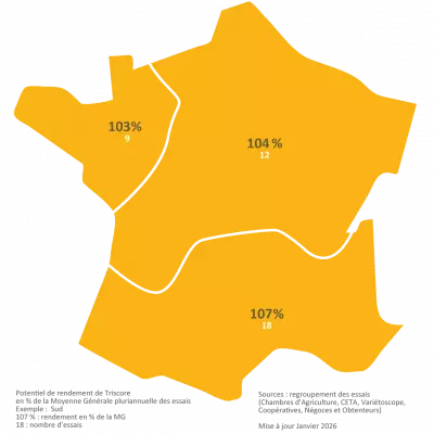 Source : Florimond Desprez ; légende : https://fd-link.com/legende Les renseignements fournis dans ce document ne sont donnés qu’à titre indicatif et peuvent varier en fonction des conditions climatiques et écologiques ainsi que des techniques culturales. La résistance aux maladies concerne les maladies ou souches actuellement connues et étudiées en France. S.A.S. Maison Florimond Desprez – RCS 458 500 170 – Crédit Photos : Florimond Desprez – 02/2026