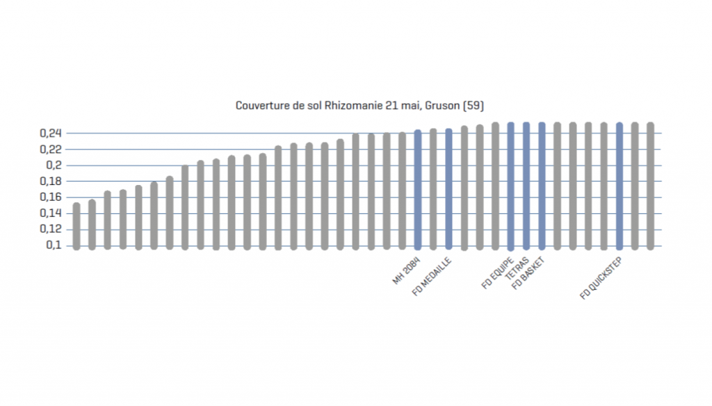 Les résultats mettent en évidence l’excellent comportement de l’ensemble des variétés Florimond Desprez, qui se distinguent par une couverture rapide du sol. Ce caractère est particulièrement marqué chez les nouvelles variétés de la gamme, FD Quickstep (tolérante à la rhizomanie) et FD Agility (tolérante aux nématodes).